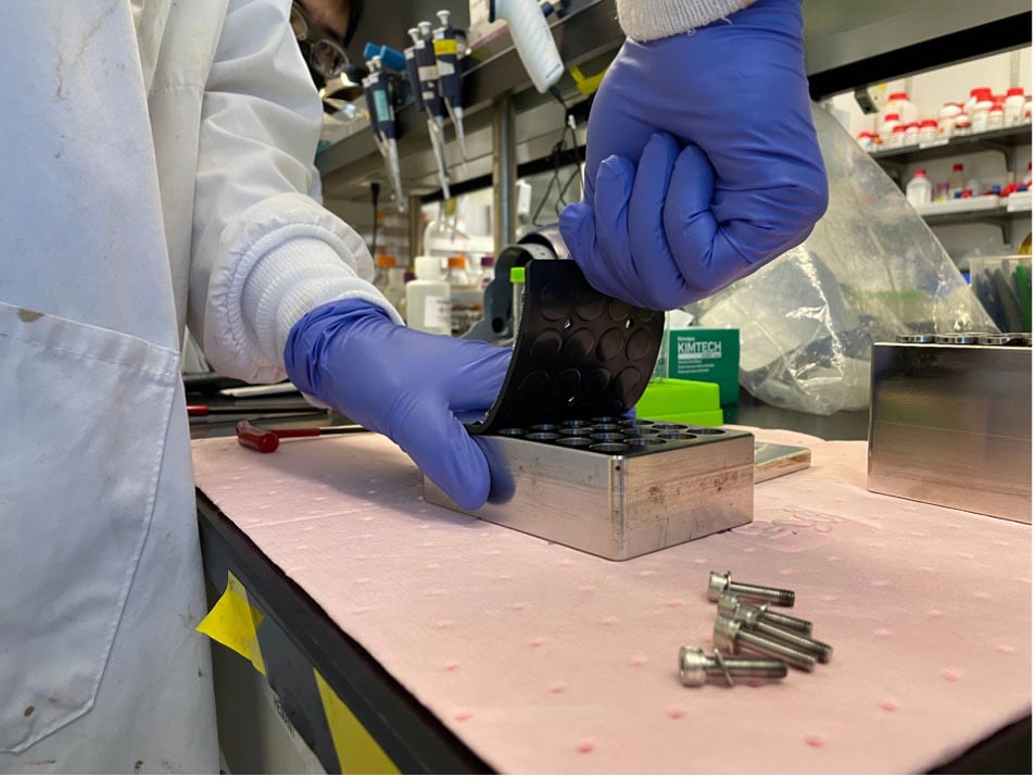Engineering went into each component of the new small-batch reactor. The reactor is made of a base constructed of 316L stainless steel, a material chosen for its affordability, machinability, and chemical compatibility with the intended testing materials. It was designed to match the dimensions of a standard 24-well plate to facilitate compatibility with other systems used for well plates, such as solid and liquid handling systems and heating and stirring systems. Each of the 24 cylindrical wells can accommodate up to 6ml of liquid.